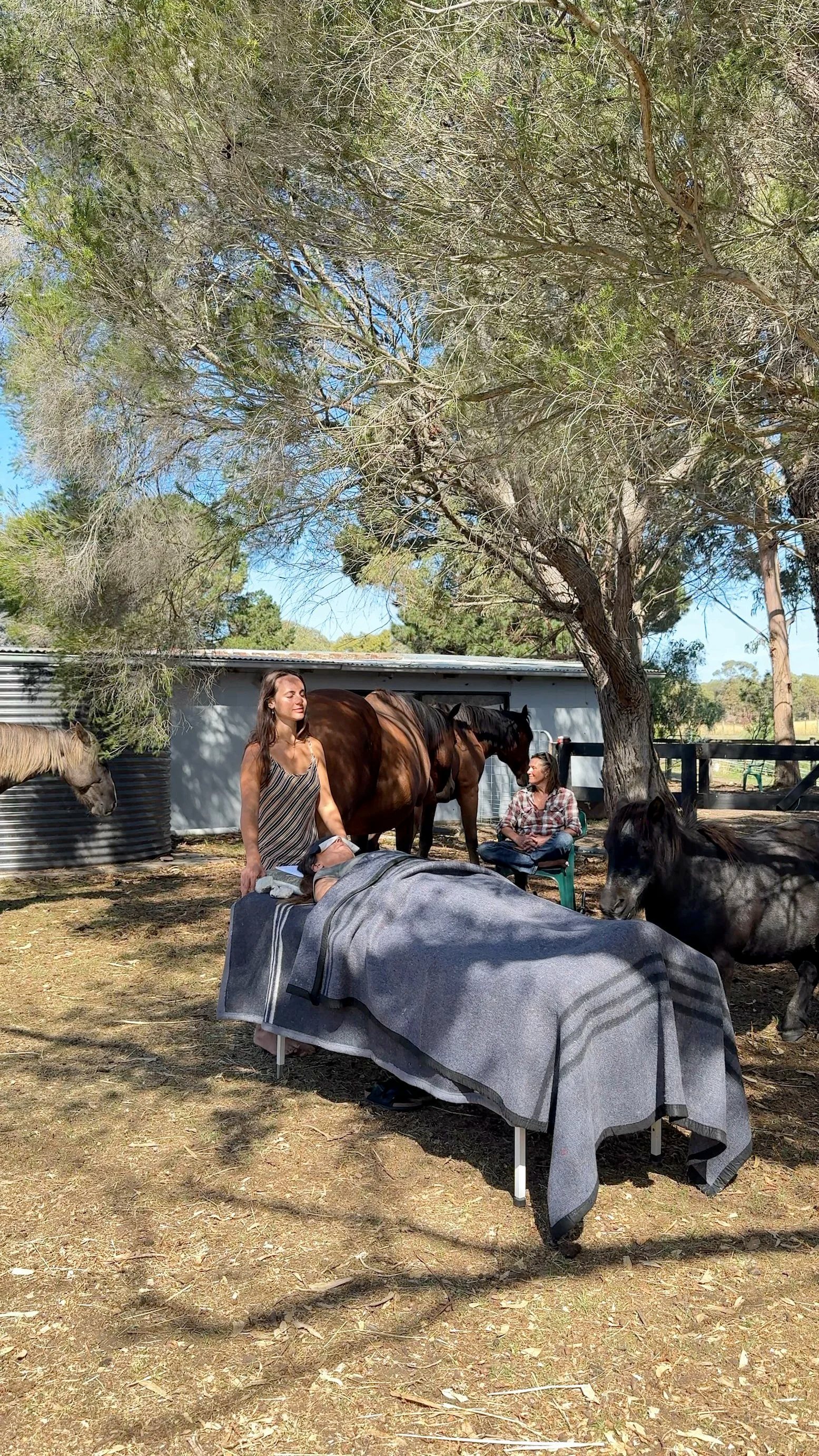Healing sessions held in the paddock at Yoga Farm, supported by the quiet presence of the horses and the land.
